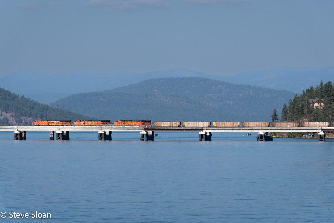 - Wednesday, September 17, 2025, at 4:30 p.m. in The Funnel a.k.a the BNSF Railway (BNSF) Spokane Subdivision, a 4+0 eastbound BNSF intermodal train was about to cross Lake Pend Oreille, north of Sagel, Idaho, approaching Sandpoint. It had 8255, 4246, 4730 and 6503 for power.
