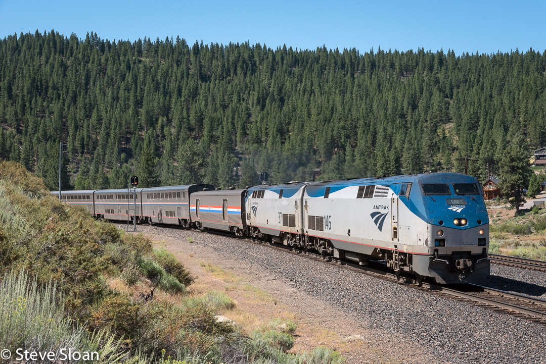 - On Friday, August 2, 2019, Amtrak Number 5 led by GE P42s 146 & 37 is along the Truckee River headed west.