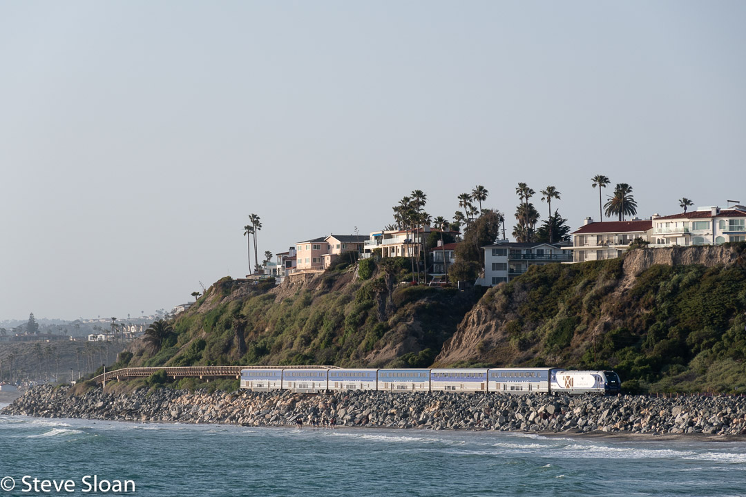 - At 4:40 p.m. on Thursday, March 10, 2022, California DOT (CDTX) 2120 leads southbound Surfliner train 580 past surfers and the pier at San Clemente, CA.
