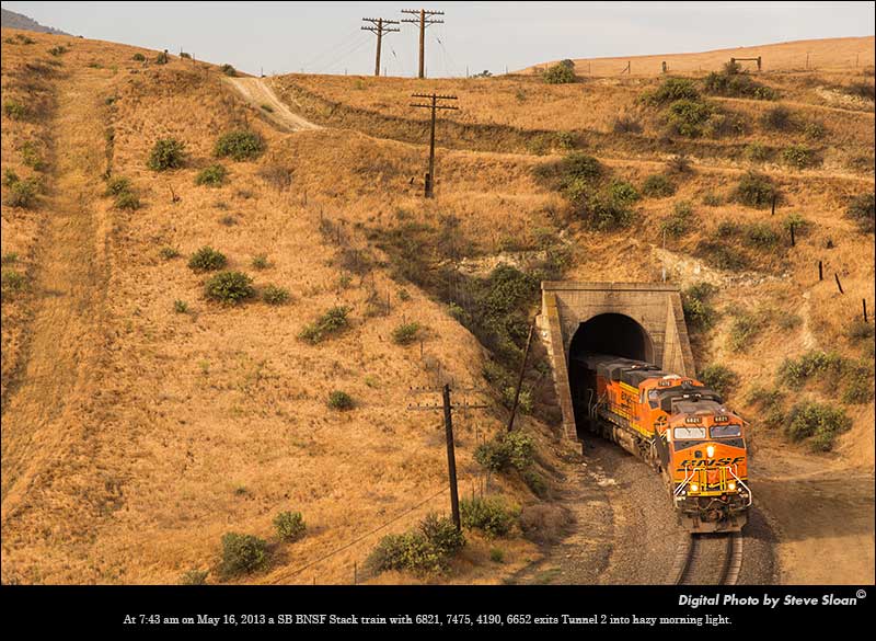 - At 7:43 am on May 16, 2013 a southbound BNSF Stack train with 6821, 7475, 4190, 6652 exits Tunnel 2 into hazy morning light. Tunnel 2 is between Bealville and Caliente, CA in the Tehachapi mountains, east of Bakersfield, CA.