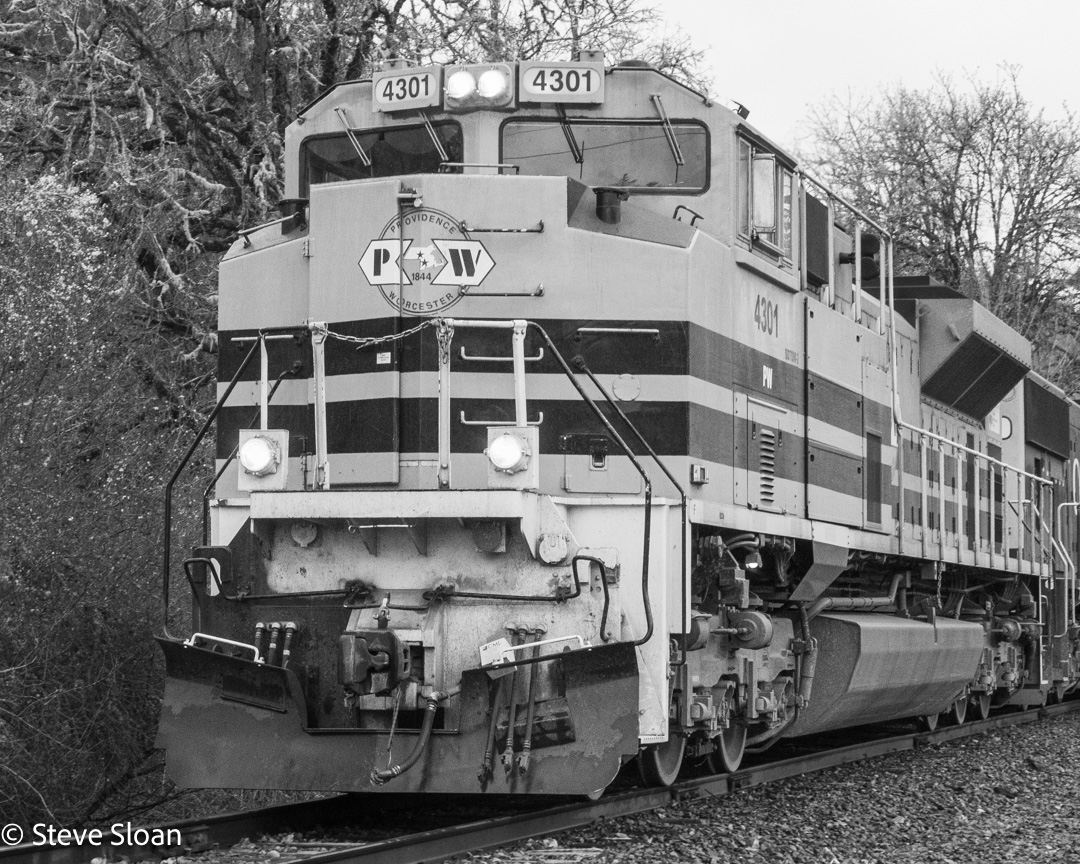 - Providence and Worcester (PW) 4301, CORP 4675, Missouri and Northern Arkansas (MNA) 2745, ARZC 3998 and PW 4302 on the Central Oregon and Pacific Railroad (CORP) at Curtin Hill Rd. in Curtin, OR, at 9 a.m. on Wednesday, March 20, 2024.