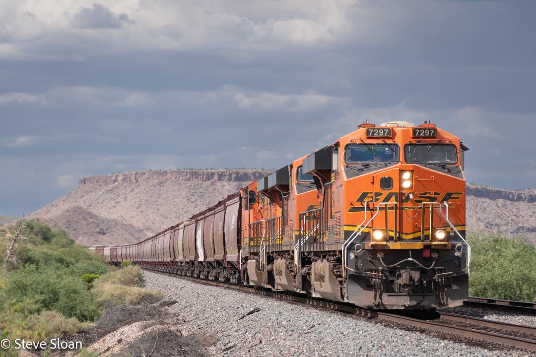 - At 4 p.m. on Sunday, June 23, 2024, a westbound BNSF Railway (BNSF) 3+3 grain train at East Valentine, AZ has BNSF 7297, 7298, 7691 + 5541, 1099, 4125 as power.