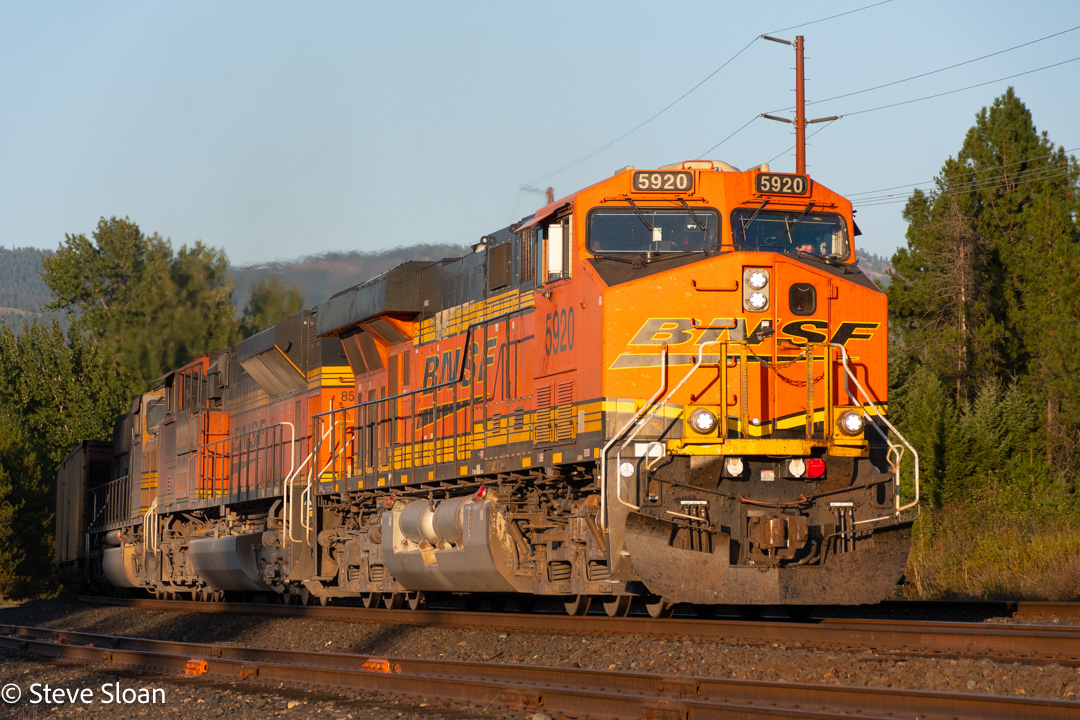 - Wednesday, September 17, 2025, at 6:00 p.m. in The Funnel a.k.a the BNSF Railway (BNSF) Spokane Subdivision a 3+1 westbound BNSF coal train was near Algoma, Idaho. It had 5920, 8507, 9892 + 6876 for power.