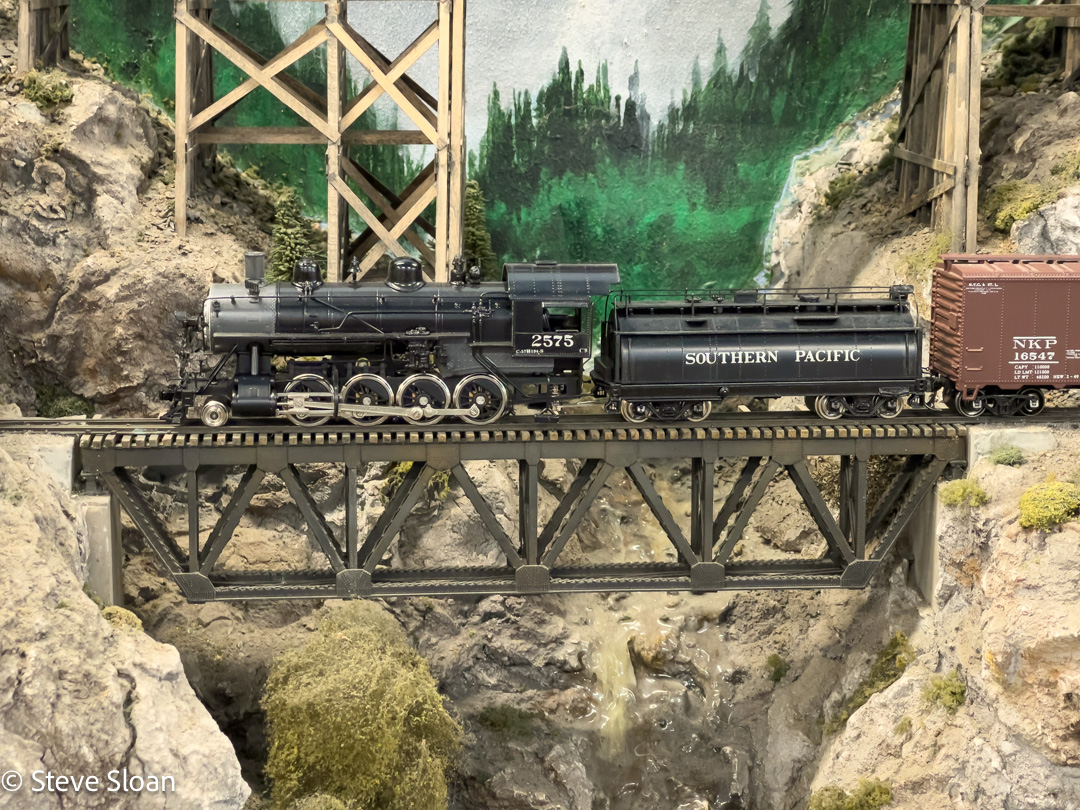 - On Saturday, February 21, 2026, at the California Central Model Railroad Club (CCMRC) in the historic Agnew depot in Santa Clara, CA, my HO model of Southern Pacific (SP) 2575 crossed the middle trestle over "Mouse Creek." This is a Sunset Models "Prestige Series" factory painted DC Brass 2-8-0 model.