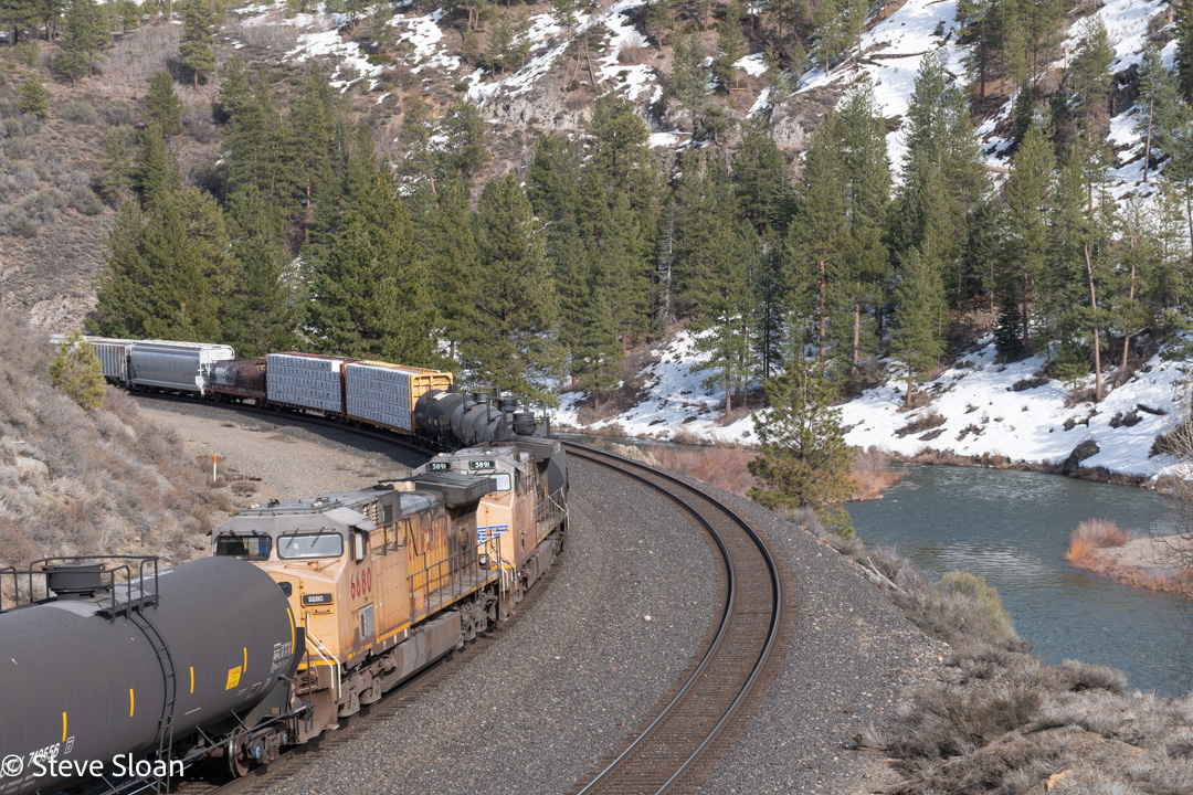 - On Sunday, April 23, 2023, at 4:30 p.m., at the Hirschdale Road Overcrossing east of Truckee, CA, an eastbound UP 3+2 manifest is powered by UP 6177, 5013, 6351 + 5891, 6680.