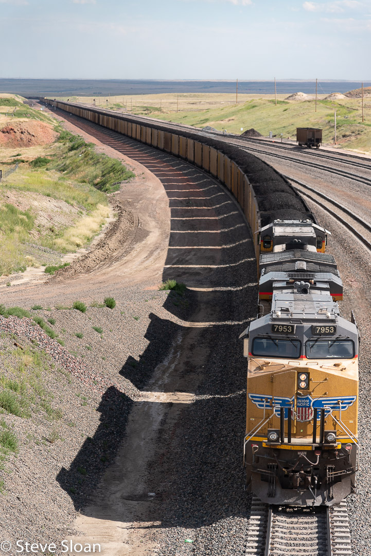 - In the Powder River Basin at Logan Hill, WY, on Tuesday, July 30, 2019, a Union Pacific Railroad Company (UP) westbound 2+3 empty coal train meets an eastbound UP 2+2 loaded coal train. The power on the westbound empty train is UP 7489, 7776 + two unrecorded and 8949. The eastbound loaded train has 6501, 8228 + 6812, 7953.