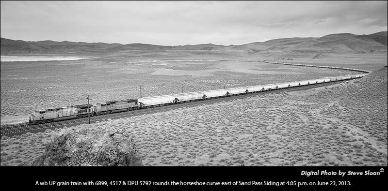 - This was shot with my D600 with a 28mm f2.0 prime. A westbound Union Pacific grain train with C44/60AC 6899, 4517 and DPU 5792 goes around the horseshoe curve east of Sand Pass Siding at 4:05 p.m. on June 23, 2013. Ken Compton and I were on the top of a hill in Sand Pass, Nevada shooting the grain train on a windy and chilly June 23, 2013.